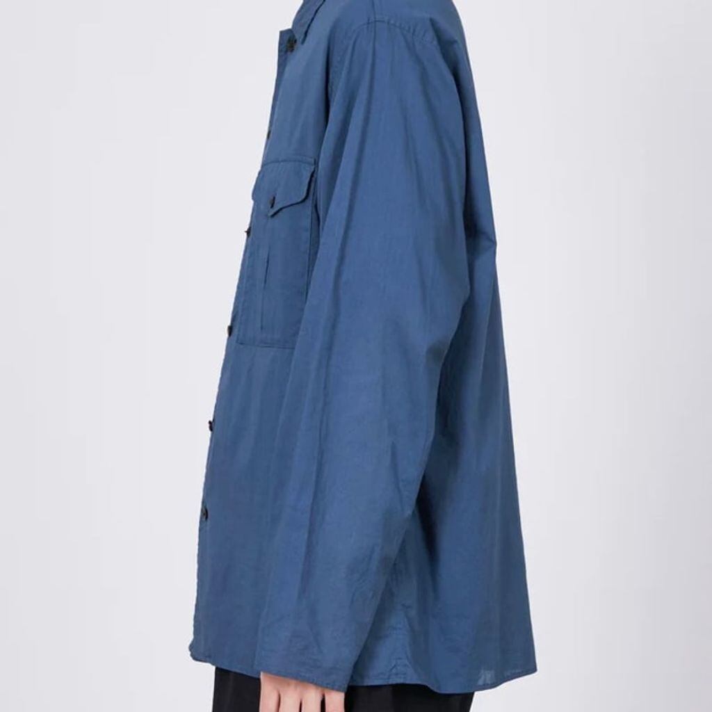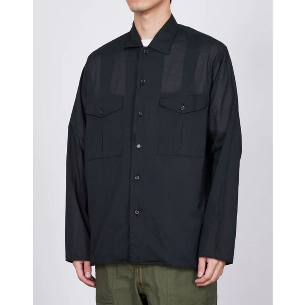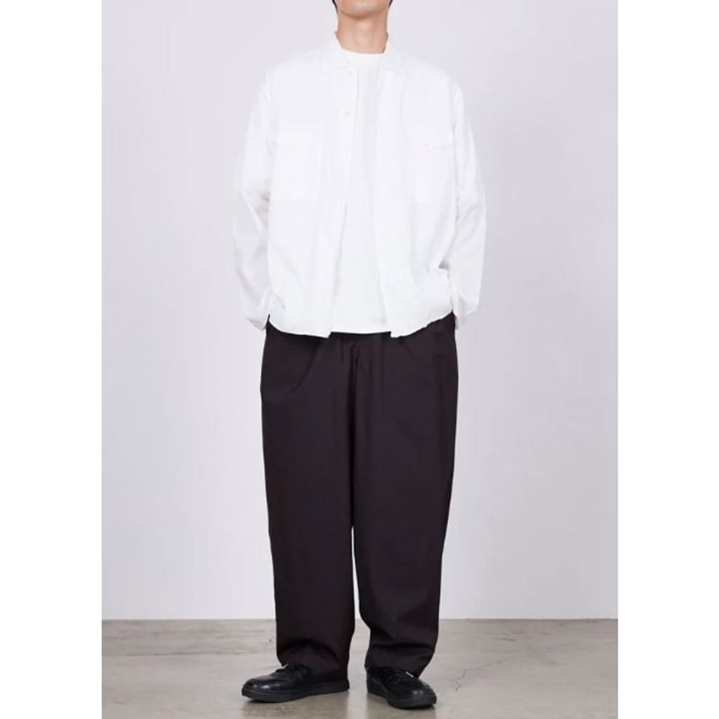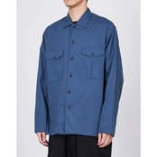 1940 年代にアメリカ陸軍で支給されていたオフィサーシャツをベースにした一着。両胸にある大きなポケットと、台襟のない仕様でオープンカラーのような雰囲気にしています。シルエットは肩幅、身幅ともにゆとりを持たせたリラックスしたフィットです。袖口はカフスを付けていないので、袖捲りもし易くなっています。