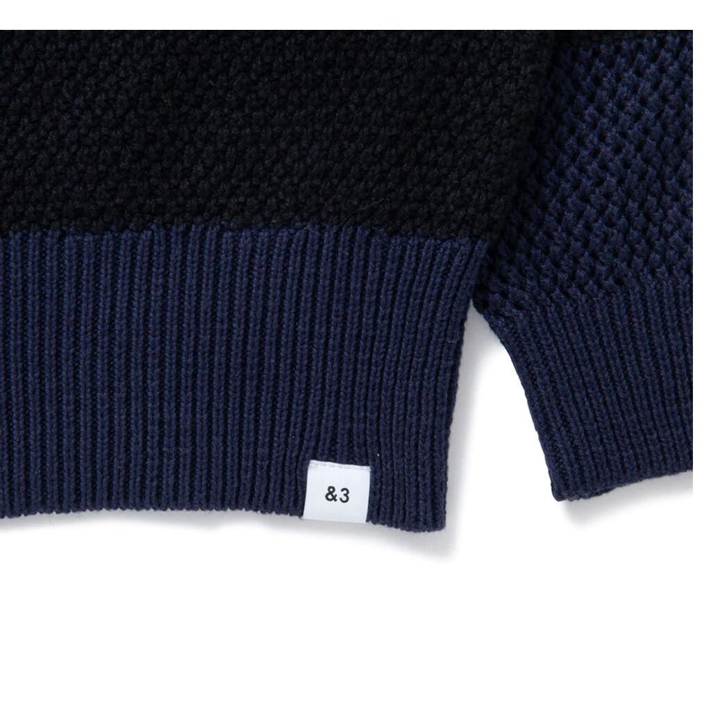 2種類の異なった編みをボーダー状に構成したセーター。ネットのような網状に編まれた部分はシースルーになっているので、見た目にもインパクトのあるアイテムに仕上げている。