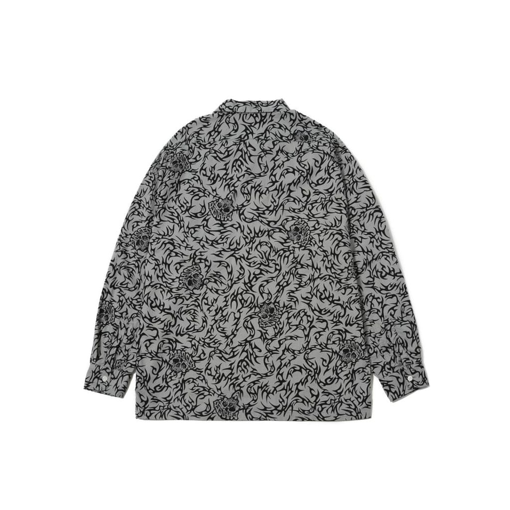 スカルもMASSESの代表的なデザインです。カジュアルなオープンカラーシャツは、オーバーサイズでライトアウターにも、ジャストサイズでミニマルに着こなしても春夏のコーディネートの主役になります。今シーズンのカラーは落ち着いたグレーでリリースです。