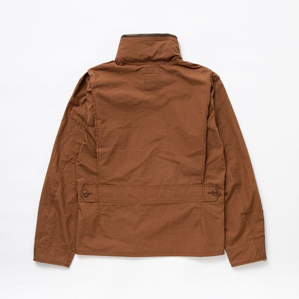 高密度に織り上げたオリジナルコットンタイプライター素材を使用したサマーフライトジャケット。40’sのアーカイブピースに着想を得た1枚仕立ての軽やかな仕上がり。左胸に中綿を入れ込み立体感演出をした台座付きサークル型フェルトワッペンを叩きつけ、両腰にはファスナー付きポケット、左腕にペンポケット、ウエスト背面にアジャスターボタン、両袖には開閉用ファスナー、襟内側にフードを収納した手の込んだディテールワークが凝縮されたデザイン。背面両肩にアクションプリーツを採用し、腕稼動にストレスを感じさせない仕様。着用時に脇下から体に沿う様に計算された縦のラインが綺麗なレギュラーフィットシルエット。1色5サイズ展開。