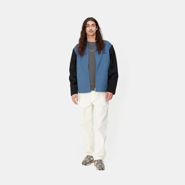 モジュールスクリプトジャケットは、ミッドウェイトのポリコットンツイル製で、裏地は無い仕様になります。フロントはジッパーで開閉、フロントにはウェルトポケットが2つ付き、胸にはスクリプトロゴの刺繍が施されている。