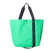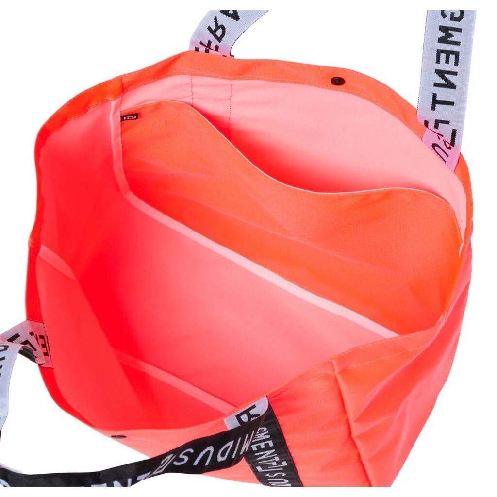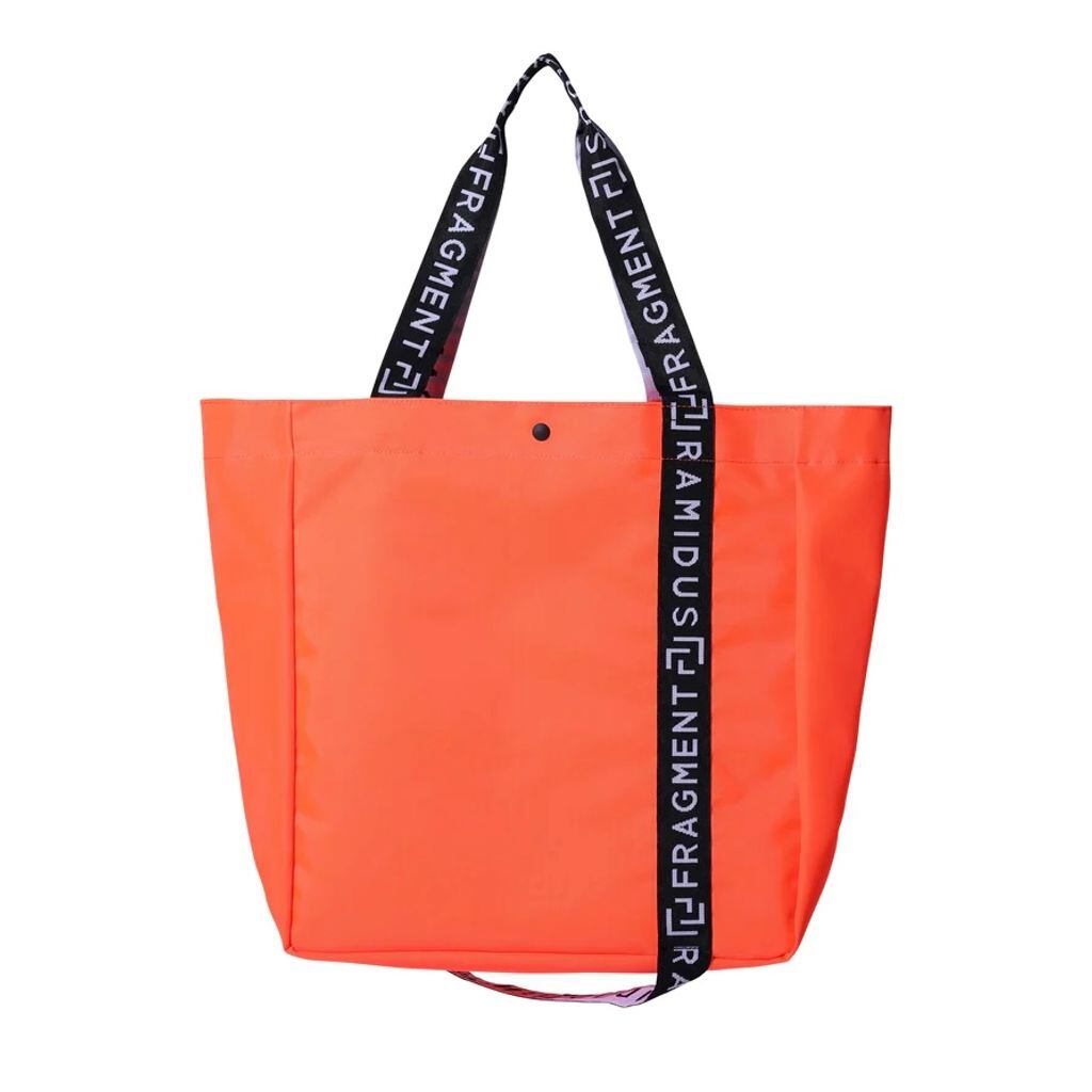 手持ち、肩掛けで使えるマガジンサイズのボックス型トートバッグ。1本のテープで切れ目無く構成されたハンドルは、両ブランドのロゴが織り込まれたfragment designとのコラボレーションを象徴する特別仕様。