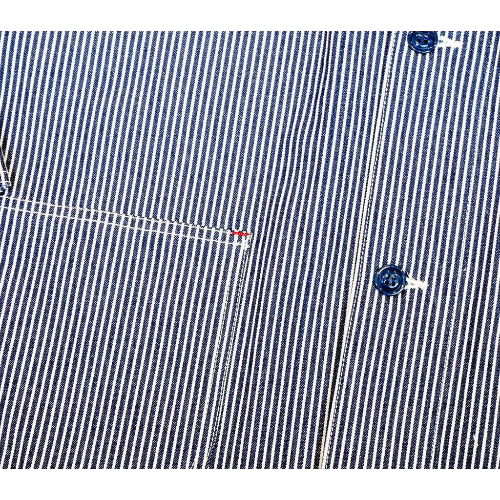 古き良き時代のワーカーたちのユニフォームをイメージし、 スタンドカラーでありながら第一、第二ボタン辺りが開くようにデザインし、襟元の動きも楽しめます。