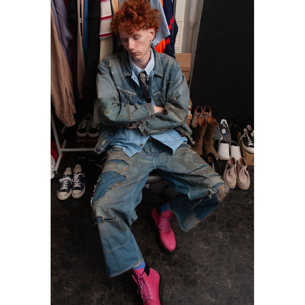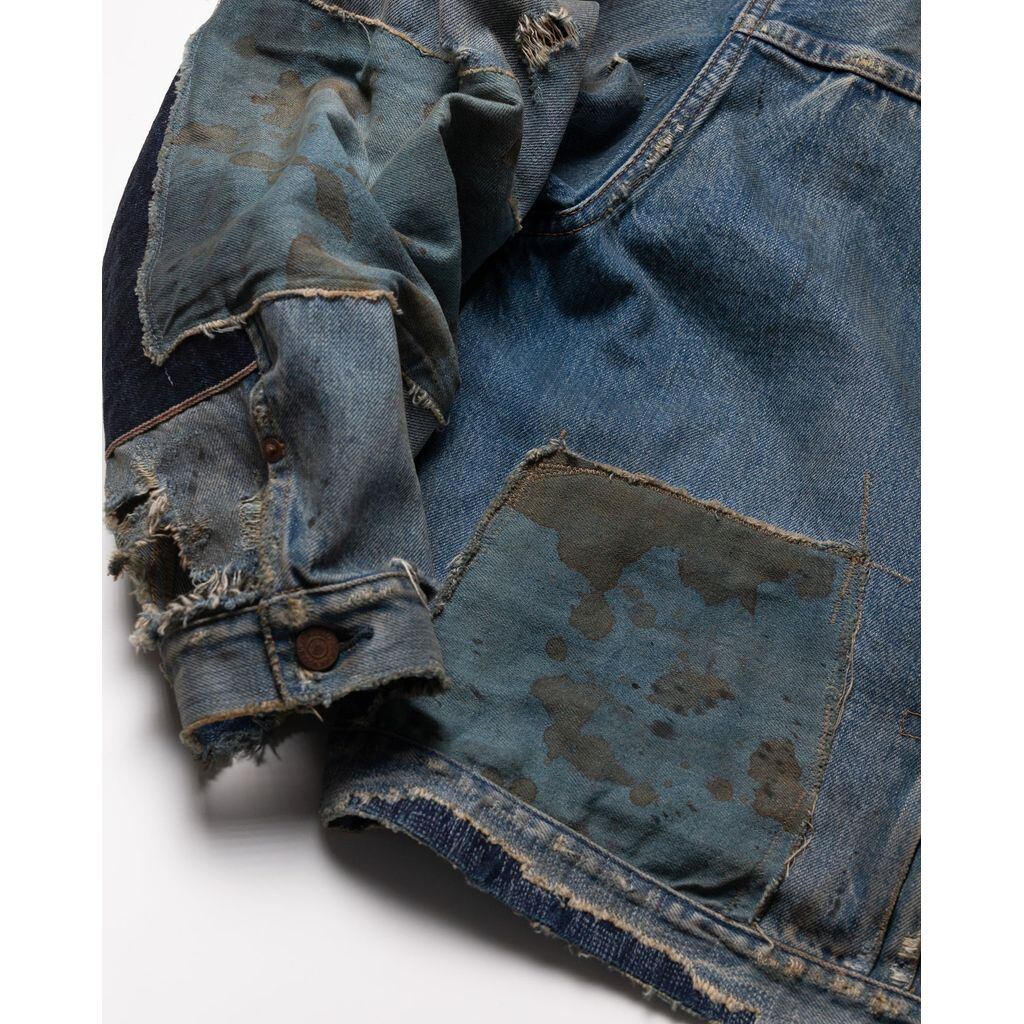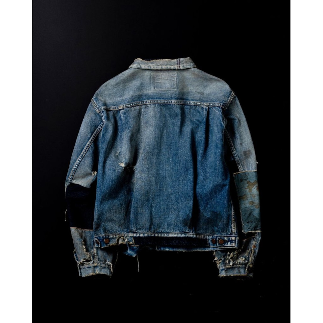 ベースはリアルな中色エイジングで仕上げ、裾、袖を中心に激しくダメージを施し複数の当布でパッチワークリメイクしております。
