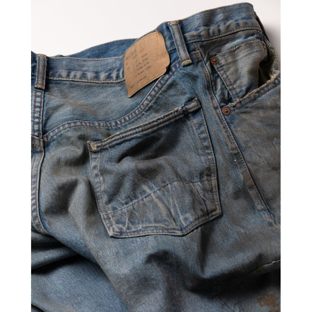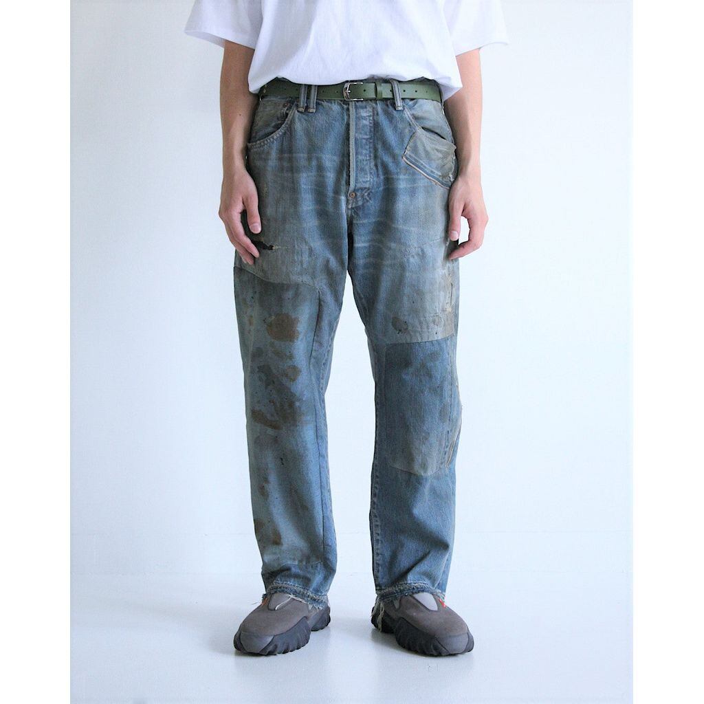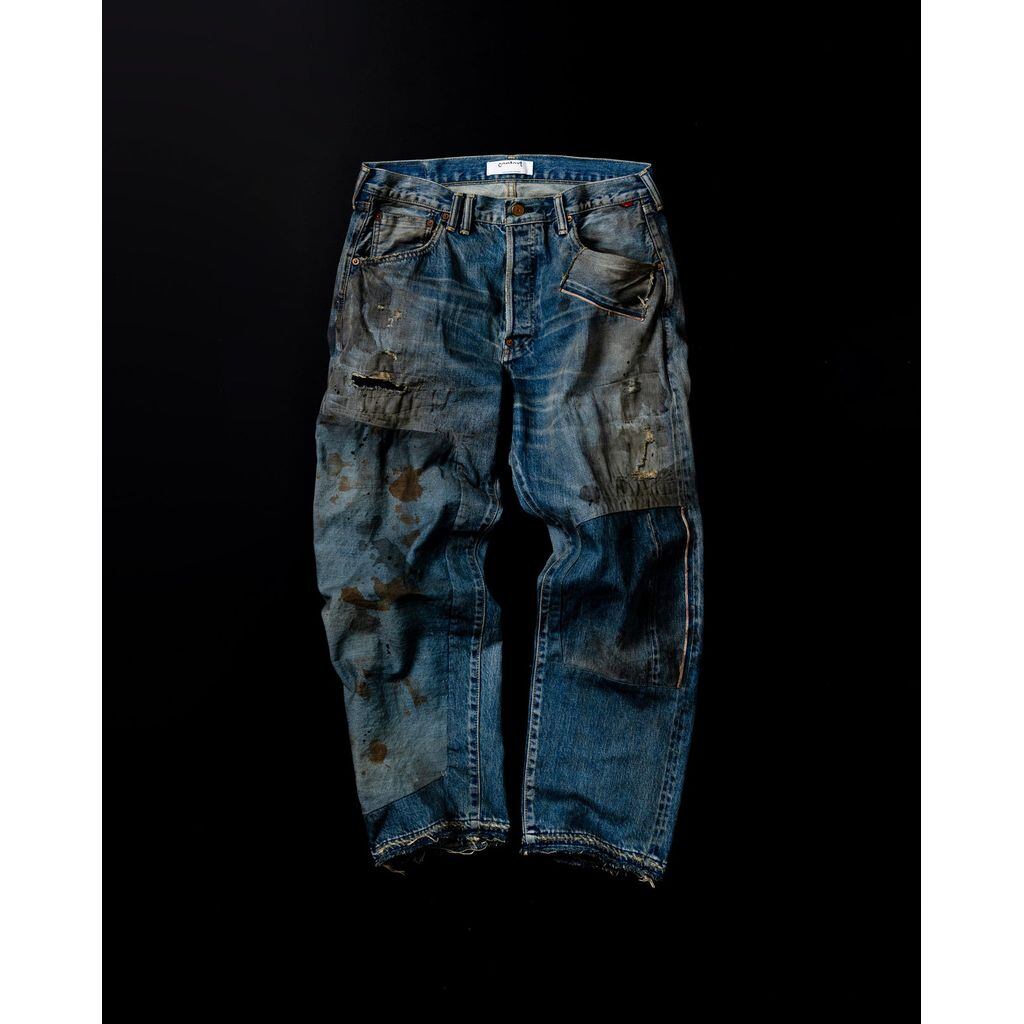 ベースはリアルな中色エイジングで仕上げ、両膝を中心に激しくダメージを施し複数の当布でパッチワークリメイクしております。