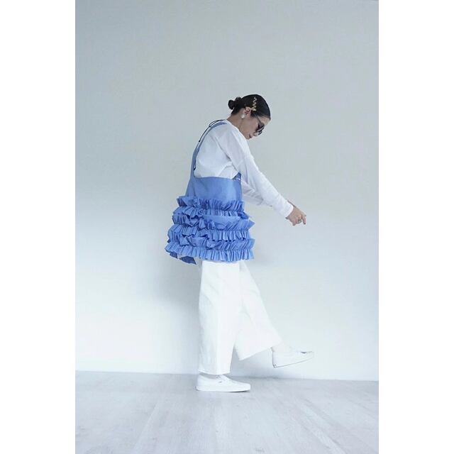 フリル部分に隠しポケットが付いています。なのでポケットのないワンピースやスカートに合わせて着ると、ポケットとしても便利に使うことが出来るようにしました。白いTシャツとロングスカートなどに合わせてみてください。