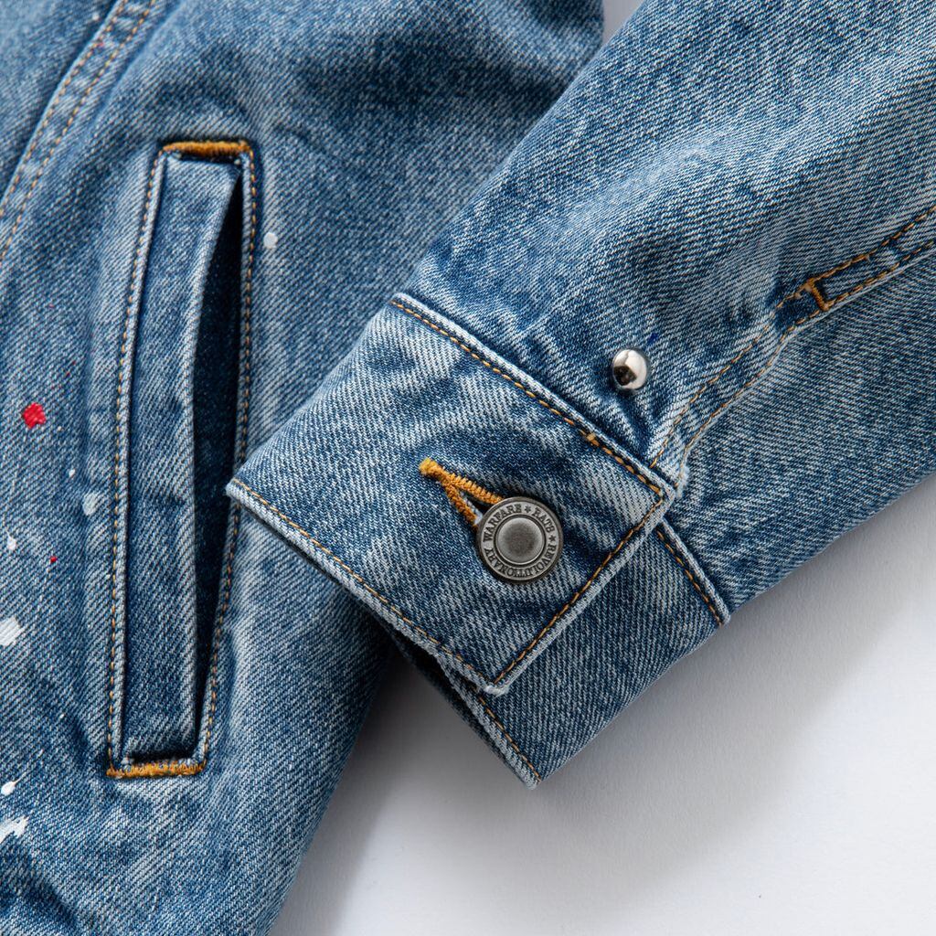 13.5oz.のデニム生地を使用したトラッカージャケット。身頃全体にユーズド加工、ペンキでドリップ、各所にスタッズを36発打ち込んだ手の込んだ仕様。前身頃左胸にオリジナルグラフィックのワッペンを叩きつけ、後身頃中央にはオールドスクールなタッチで仕上げた“ROUGH RIDERS”のグラフィックをラバープリント。両胸にフラップポケット、左胸ポケット上部にはピスネームを叩きつけ、両腰にスラッシュポケットを配置。着用時に脇下から体に沿う様に計算された縦のラインが綺麗なレギュラーフィットシルエット。