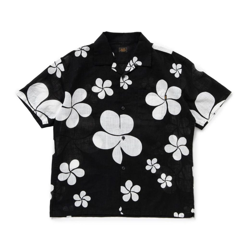 レーヨン/コットンの混紡素材を使用したオープンカラー仕様の半袖ハワイアンシャツ。パームツリー総柄プリントで表現したオリジナルテキスタイルを採用。左胸にボタン付きフラップポケットを配置、ポケット縁にはratsロゴが刺繍されたピスネームを挟み込んだデザイン。裾はクラシックなボックス型とクラシックな意匠を採用。身幅にややゆとりのあるボクシーなシルエット。ワンウォッシュ仕上げ。