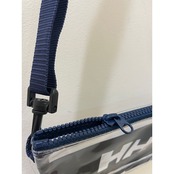 クリアな素材をボーダー柄にすることで、程よい目隠しにもなっています。トップはファスナー仕様に。水を通さない素材のため、海やプールでちょっとした小物を入れておくバッグとして重宝。リゾートや街でのスタイリングにも活躍します。