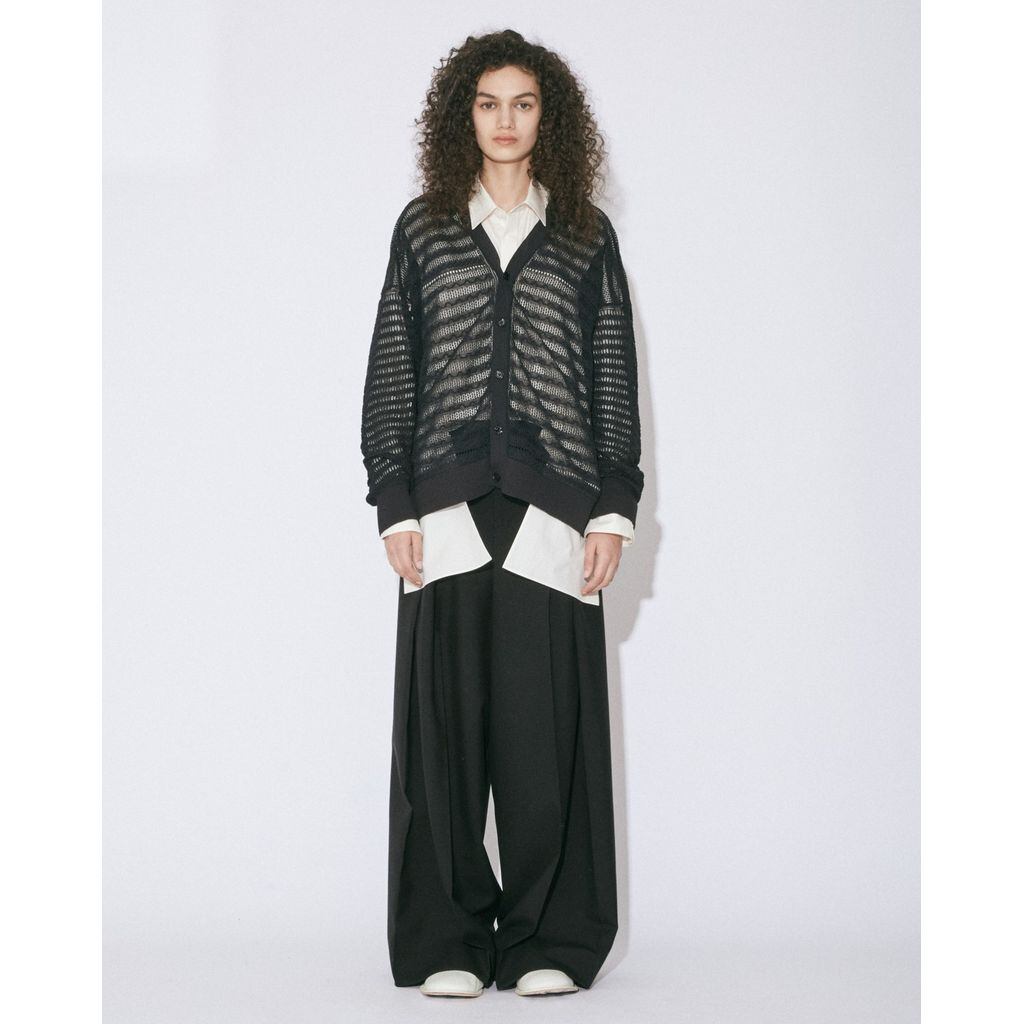 ・2種類の糸を組み合わせ、透し柄を編み立てたVネックのニットカーディガン