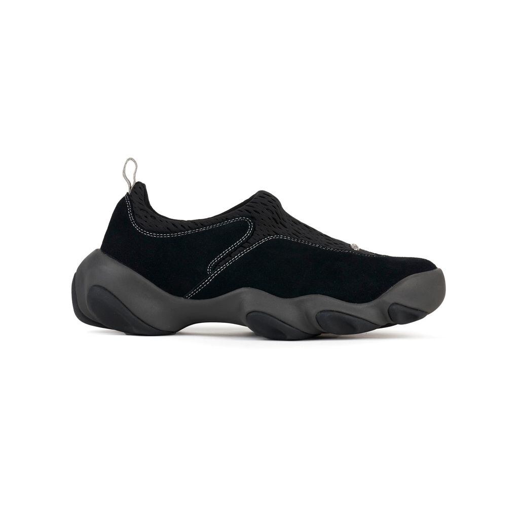 このフレッシュシューズは、ソフトな手触りのブラックキャビアスエードのアッパーに、コントラストの効いたステッチで縫い合わせたエリプソイドメッシュを組み合わせている。白のステッチ、グレーのナイロンプラー、ボルカニックアッシュのラバーアウトソールなどの精密なディテールによって、モノクロームのシューズは、組み立ての品質を通して、さまざまな光の陰影を提供する。