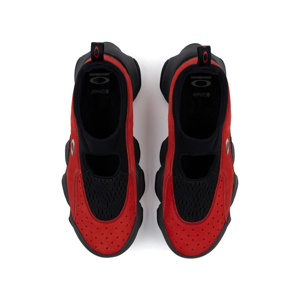 噴火する火山の激しさと滑らかな海の静けさを併せ持つOakley Factory Team Flesh Sandalsは、マグマ色のスエードレザーアッパーに、ブラックのEllipsoidalメッシュパネルが涼しさを添えている。ユニークな組み合わせのこのシューズは、ブラックキャビアのトラクションポッドとアウトソールで最適な接地感を実現している。