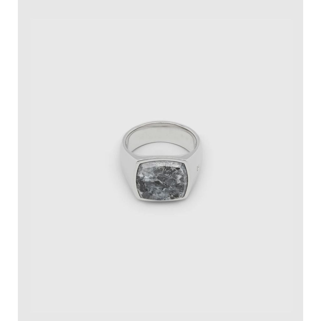 このリングはポリッシュ仕上げのスターリングシルバー925製で、表面を強化し変色を防ぐためにホワイトロジウムプレーティングが施されています。
