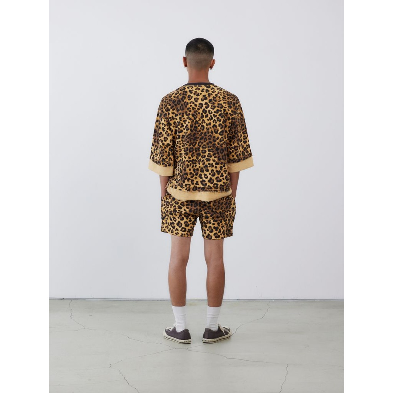 ショートレングスでミニマルなシルエットのスウェットショーツです。ミディアムオンス裏⽑にレオパードプリントを施した⽣地を使⽤しています。同⽣地のデザインスウェットシャツの展開があります。