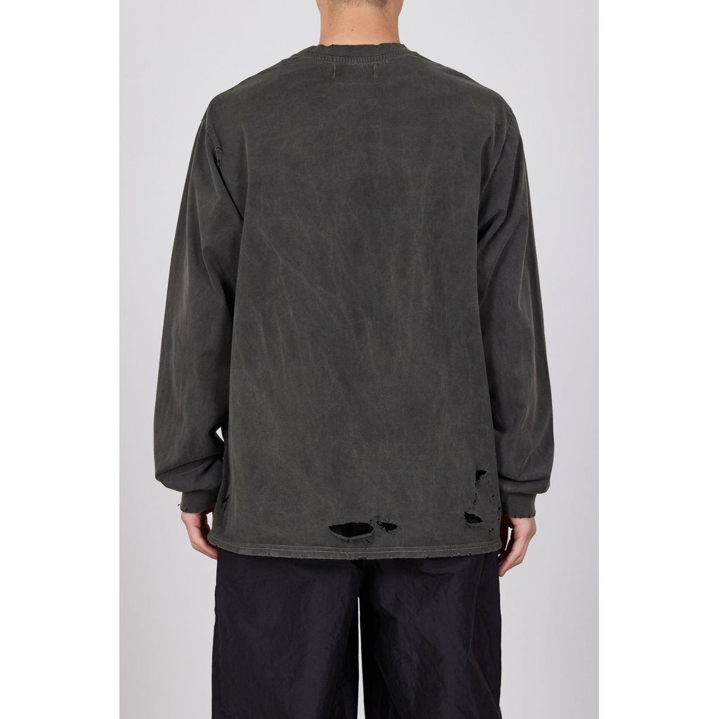 「DAMAGED」は黒の顔料染めを施した後、バイオソーピングすることで色を落とし、さらに手作業でダメージを加えました。