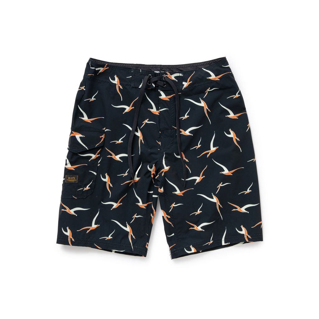 4WAYストレッチ・撥水機能に長けたポリエステル素材のイージースイムショーツ。オリジナルで作成したバードモチーフを総柄プリントで表現したテキスタイルを採用。右脇にフラップ付きポケット、ポケットにRATSロゴ入り角形ネームを叩きつけ。ウエスト正面にRATS・WAY OF LIFEのレタリングが施されたオリジナルアイレット・スピンドルを付属、サイズ調整が可能な仕様。着丈がやや短いウエストにゆとりのあるシルエット。1色5サイズ展開。