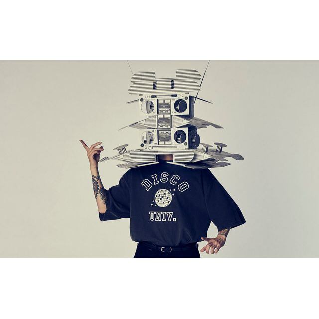 架空の音楽大学”DISCO UNIV”ユニフォーム。ミラーボールとカレッジフォントでデザインされたルーズフィットT-SHRTS。