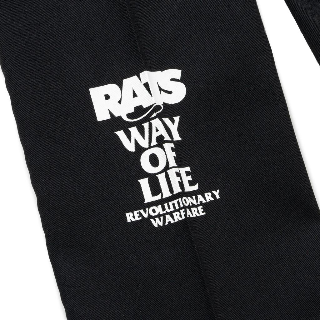 背面ポケット上にレクタングルタグ、腰裏にはラッツ柄グラフィックをリピートでプリント。ゆとりのあるシルエット。