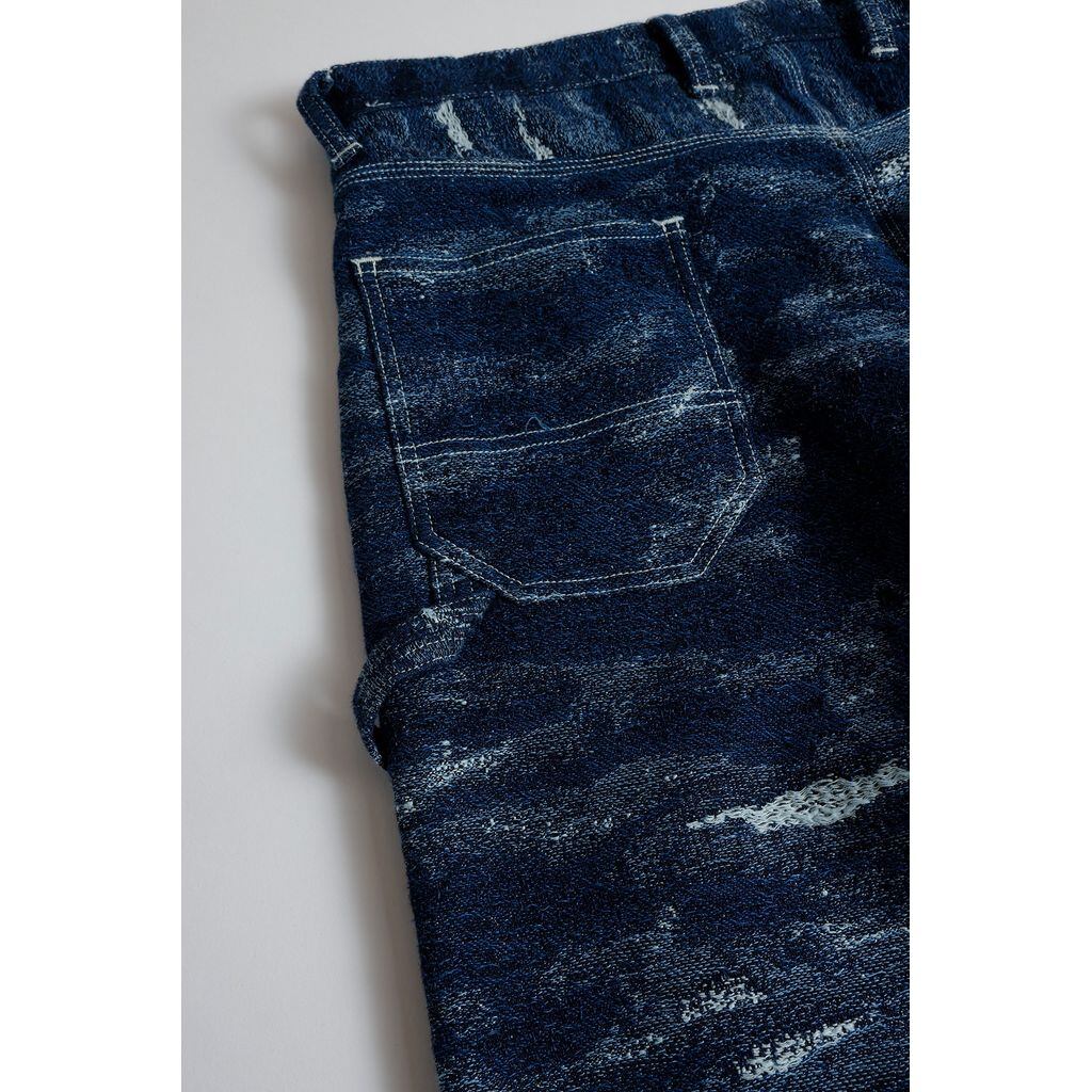 ダメージデニムをモチーフにデザインしたジャカード織のインディゴ生地を用いたパンツです。裾に向けて若干テーパードしたシルエットになっています。