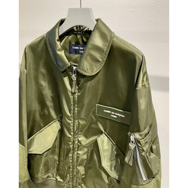ミリタリーライクなブルゾンはナイロンの表地と裏地の間にポリエステルを挟んだ3層生地を使用。USミリタリーの「CWU-45P」をモデルにしていながらも、ゆったりとした身幅にアップデートさせたコム デ ギャルソン・オムならではのシルエットが特徴。また裾の両サイドにはファスナーをプラスし、開閉させる事によりシルエットに更なる変化をつける事も可能。更にはフロントのダブルファスナー仕様などオリジナルとは異なるバランス感が新しさを感じさせてくれます。左胸のネームプレート部分にはブランドロゴ「COMME des GARCONS HOMME」を配した着脱可能なパッチを装着。オリジナルとは異なるディテールも新しい一枚です。