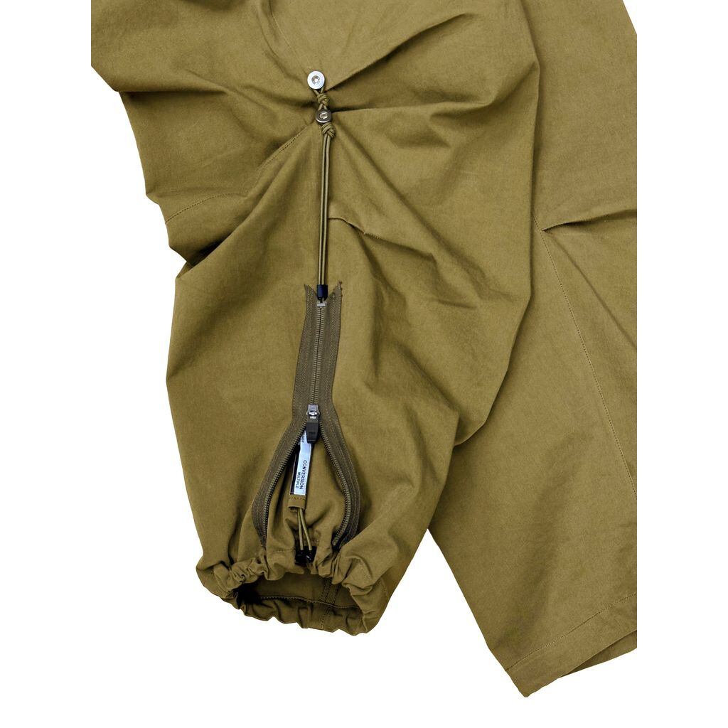 ハリ・コシに優れるコットンツイル素材を使用した変形ワイドフィットパンツ。1stコレクション時より展開するアイテムの24AWシーズン最新版。両脇にスラッシュポケット(左右にマルチ内ポケット付き)、背面左右に逆玉縁ポケットを配置。サイドのシルエットはゴムスピンドルで調整が可能。裾はファスナーで絞ることができ、スピンドルをサイドボタンに引っ掛けることでレングスバランスの調整も可能。スピンドルの絞り方次第でふくらみ・うねりを自在に作成でき、オリジナルのシルエット作成が可能。ウエストにはウェビングベルト、左右にツール用ループを装備、レッグ幅にかなりゆとりのあるシルエット。2色2サイズ展開。