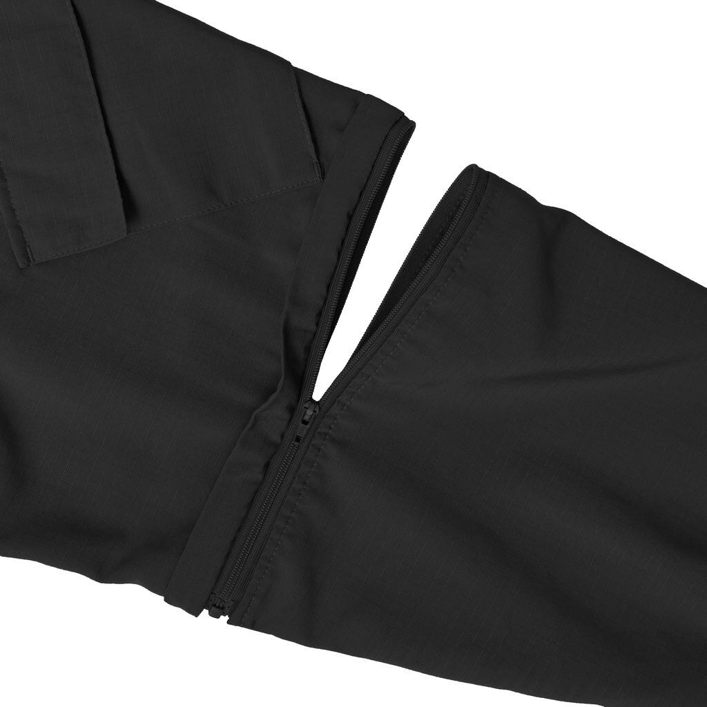 裾はレングス変化を楽しめるスピンドル仕様。フロントには大型のファスナーポケット2つ。アームにもミリタリーウェアを連想させるマチ付きのフラップポケットを装備。