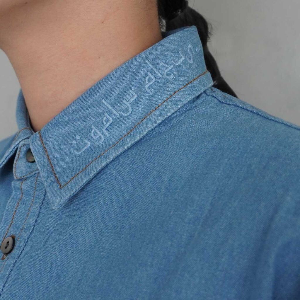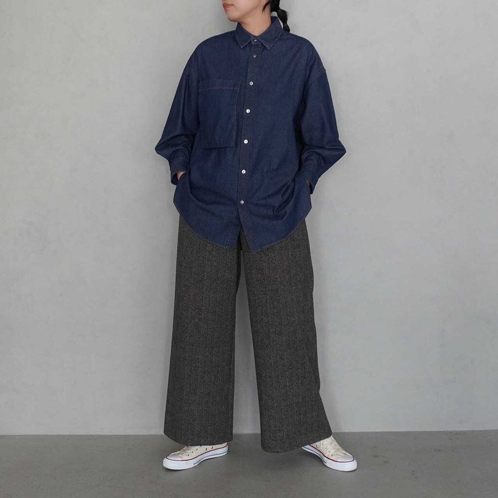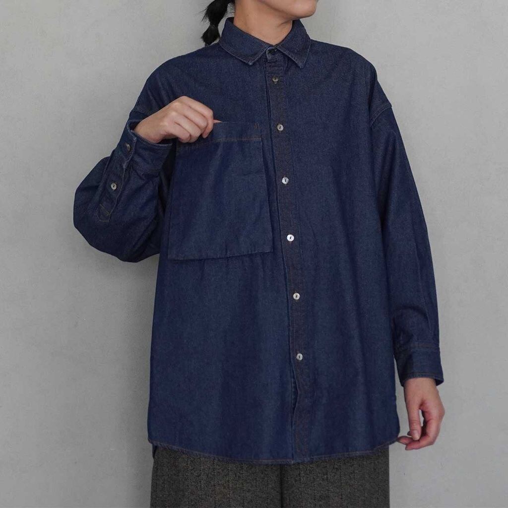 立体感ある大きなポケットが特徴的です。ポケットはマチをつけて膨らみを出しました。また、襟にはアラビア文字でThomas Magpieの刺繍を入れています。ヒップまである着丈の長さも使いやすいです。これまで作ってきた大きめのシャツは、カジュアルなプリントを施した物が多く、存在感がありました。このビッグポケットシャツは無地に大きなポケットでシンプルで、とてもコーディネートしやすく着やすいと思います。一枚で単純に着ても、モードな雰囲気も楽しめます。これまでキレイにお洋服を着ているジャストサイズトップス派の方も、是非チャレンジしてください。また、体型問わずに、細い方も身長が低い方も高い方も、グラマラスさんにもどなたにも似合ってしまう一枚です。
