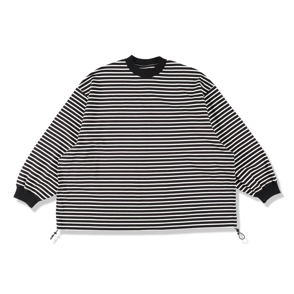is-nessオリジナルデザインのヘビーウエイトコットン天竺のボーダー柄のバルーンロングスリーブTシャツ。裾のスピンドルを絞ることによってシルエットの変化を楽しめるロングスリーブTシャツ。