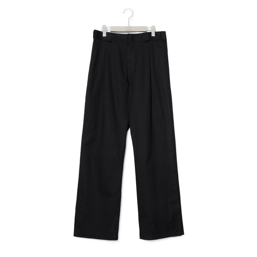 Dickiesの定番ツイルと仕様を基に、前ウエストにタック、裾にベントと隠しドット釦を配し、閉じた時はストレートシルエット、開いた時にはフレアシルエットとして着用が可能。