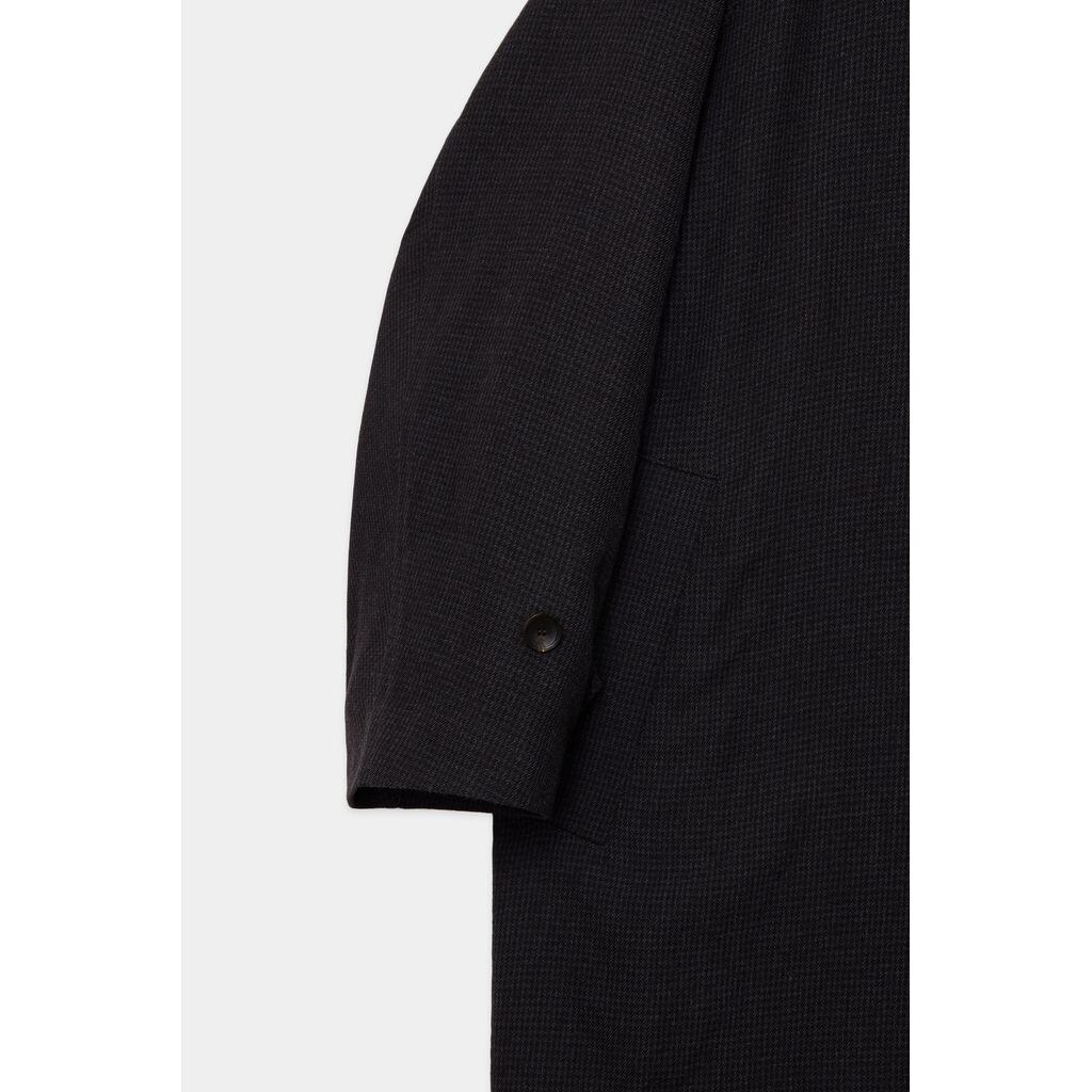 ラグランスリーブのステンカラーコート。ざっくりと羽織れるサイズ感が特徴で、ボリュームのあるインナーの上から着用してもスムーズな着心地。脇下もたっぷりと余裕のある仕立てなので、物足りなさを感じることはありません。しっかりと詰まった衿元はきりっと男性らしい印象に仕上がります。チンタブを付与しているため、衿を立てて着用することも可能です。