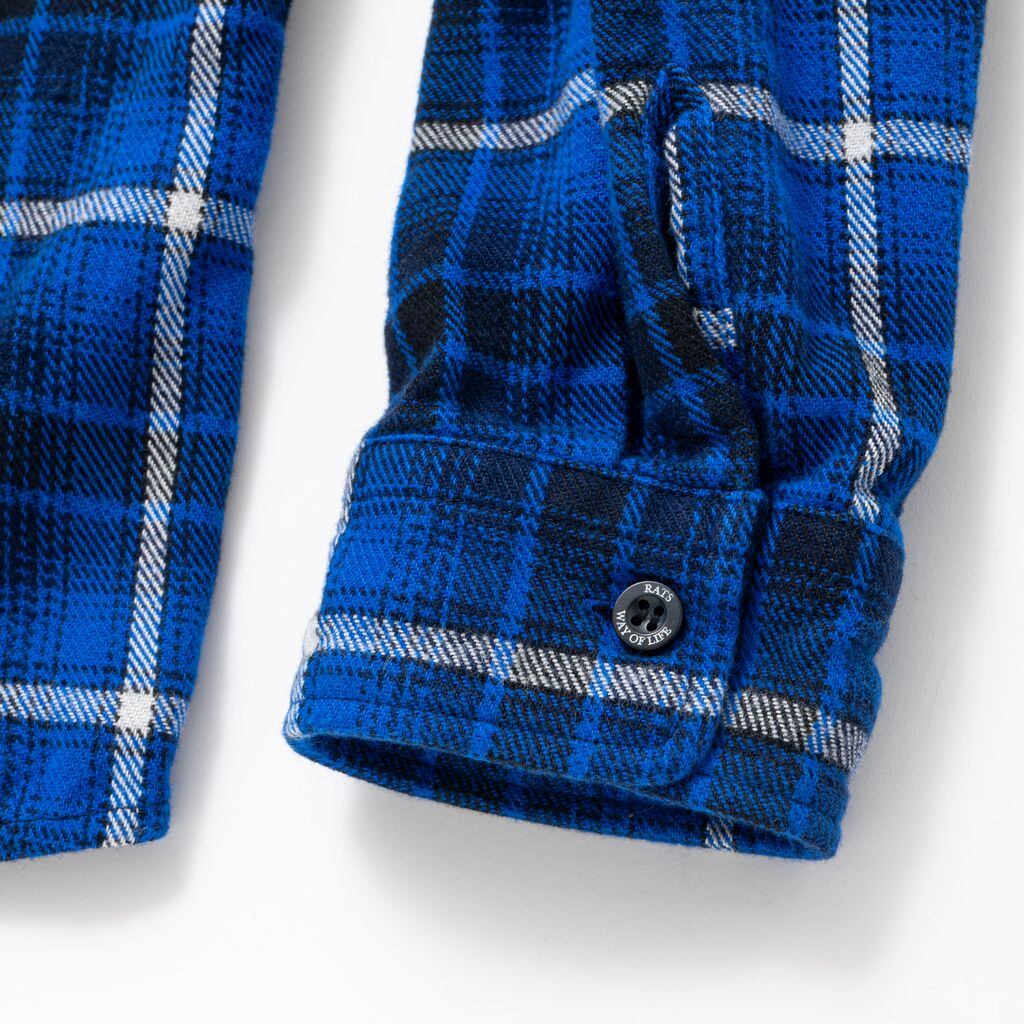 オリジナルで作成したブルーチェック柄テキスタイルのコットンフランネル素材を使用したレギュラーカラーシャツ。胸元左右にパッチポケットを配置、左ポケット脇にピスネームを挟み込み。前立て・袖口に使用したボタンはRATS・WAY OF LIFEの刻印入りオリジナルを採用、ワンウォッシュ仕上げ。裾は緩やかなラウンドカット、レギュラーフィットシルエット。1色5サイズ展開。