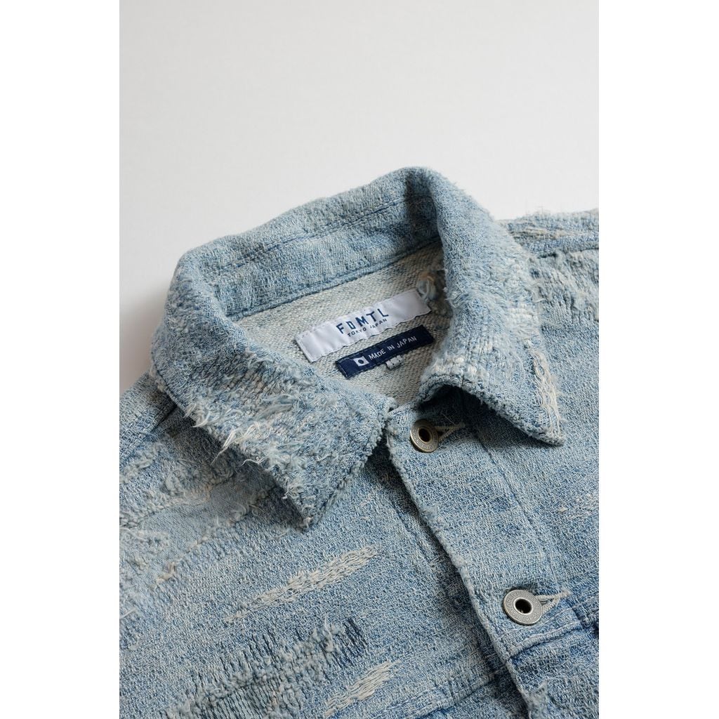 ダメージデニムをモチーフにデザインしたジャカード織のインディゴ生地をベースに、5年間着用したようなダメージとリペア加工を施しました。