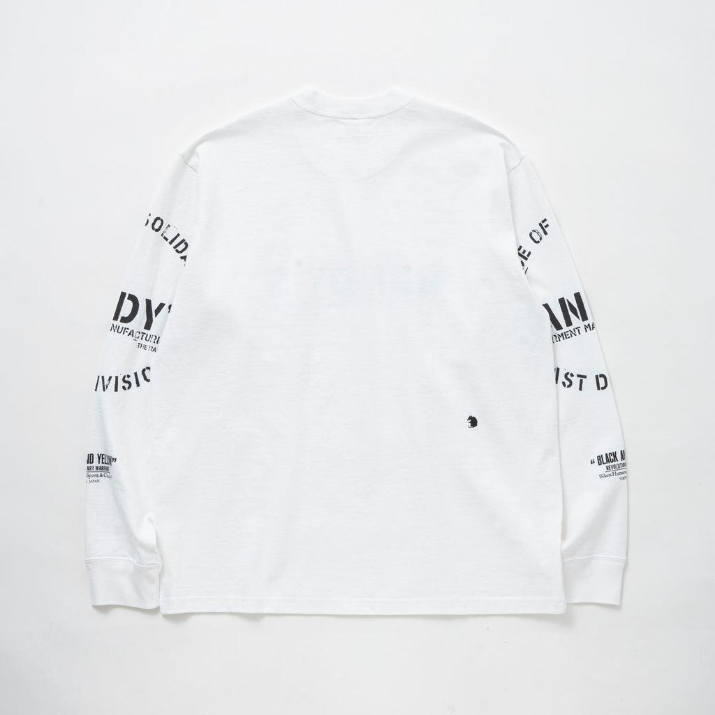 オリジナルで作成した8.5oz.のコットン素材を使用したロングスリーブTシャツ。胸元にBANDY’Sレター、スリーブ左右にBANDY’S・SENCE OF SOLIDARITY・EAST DIVISIONを組み合わせたサークル型グラフィック・BLACKAND YELLOWのレターグラフィックをラバープリントで表現したデザイン。背面右にRatモチーフを直刺繍で配置。ワンウォッシュ仕上げ。レギュラーフィットシルエット。