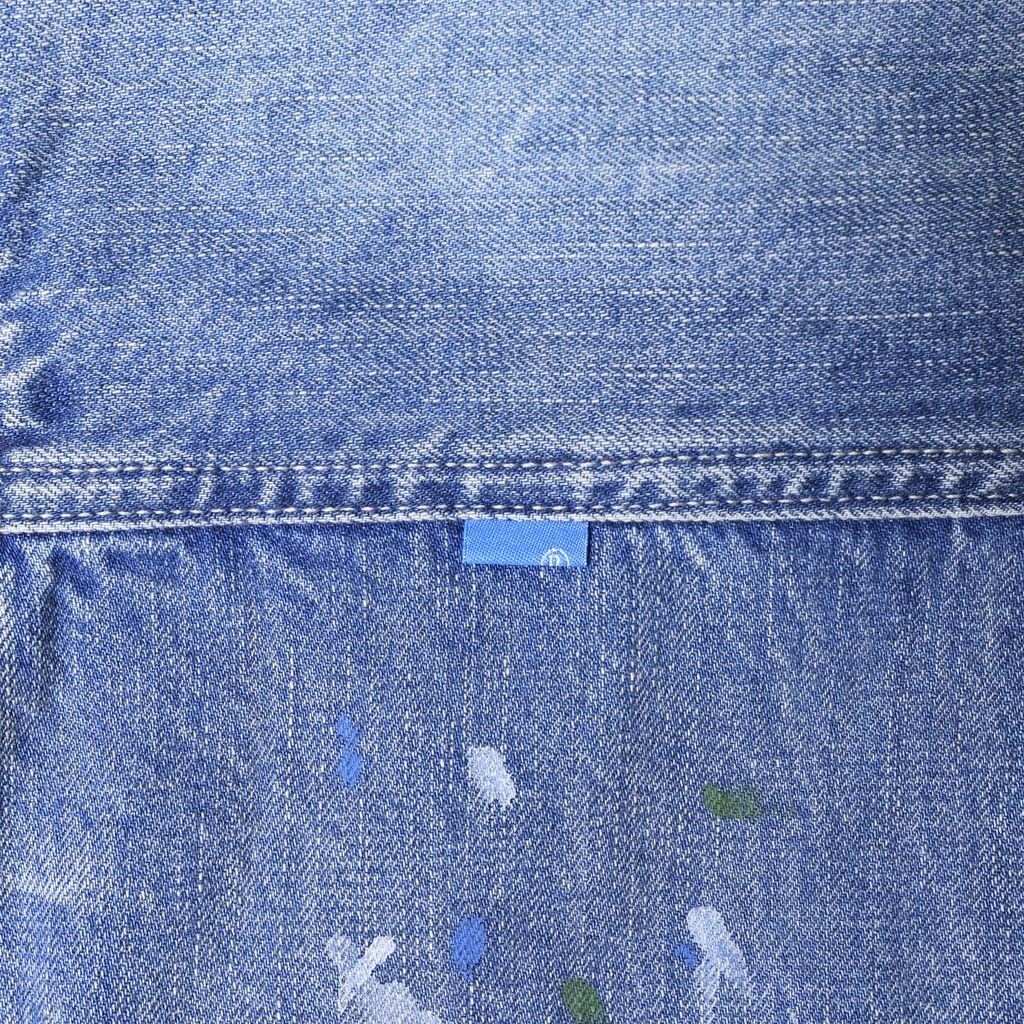 11.5ozのデニムを使用したデニムジャケット。いわゆるファースト型を現代的なシルエットにリファイン。ヴィンテージウォッシュをかけ、随所に丁寧に施されたペイント等、職人の手で一点一点加工、背中にはフラッグロゴのプリントが施されております。同じ加工のデニムとセットアップとして着用も可能です。