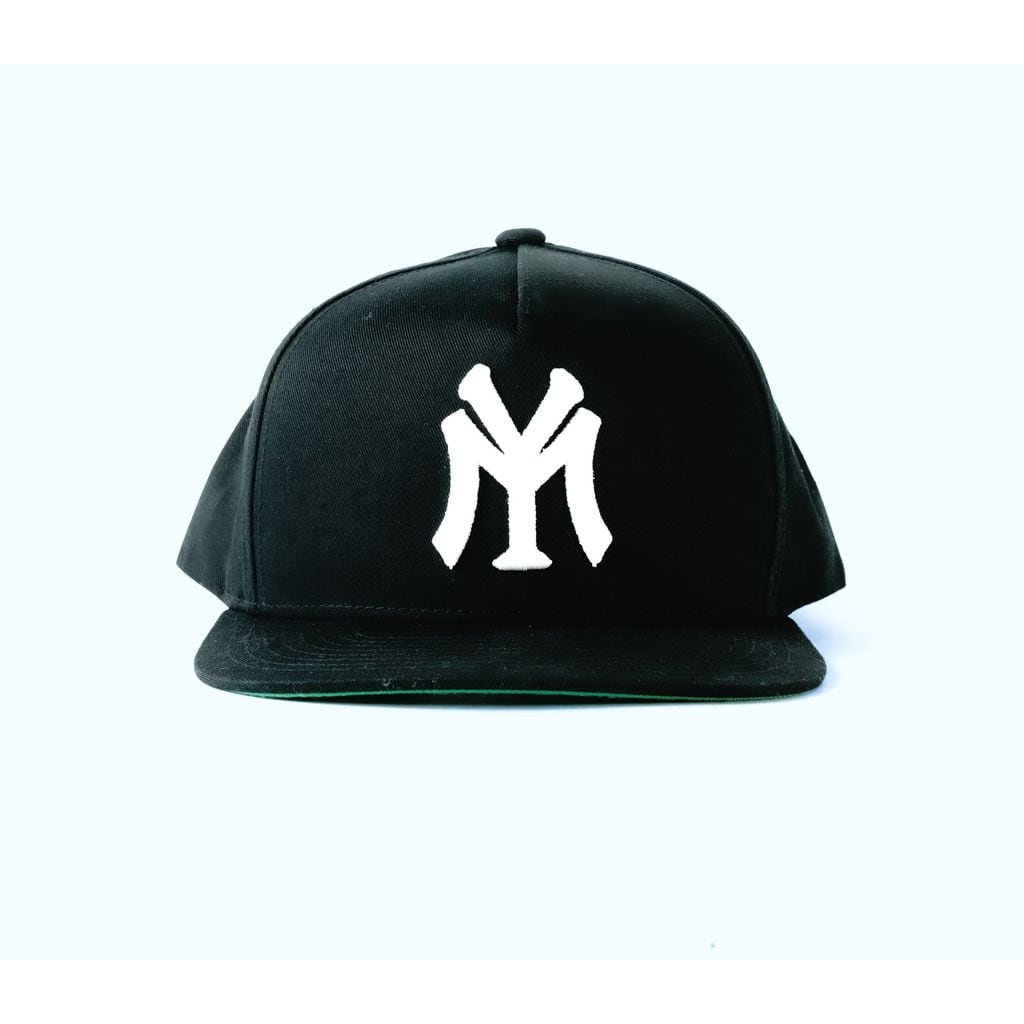 フロントにYMロゴを立体刺繍し製作した5パネルキャップ。サイズはアジャスターにて調整できるスナップバックになります。