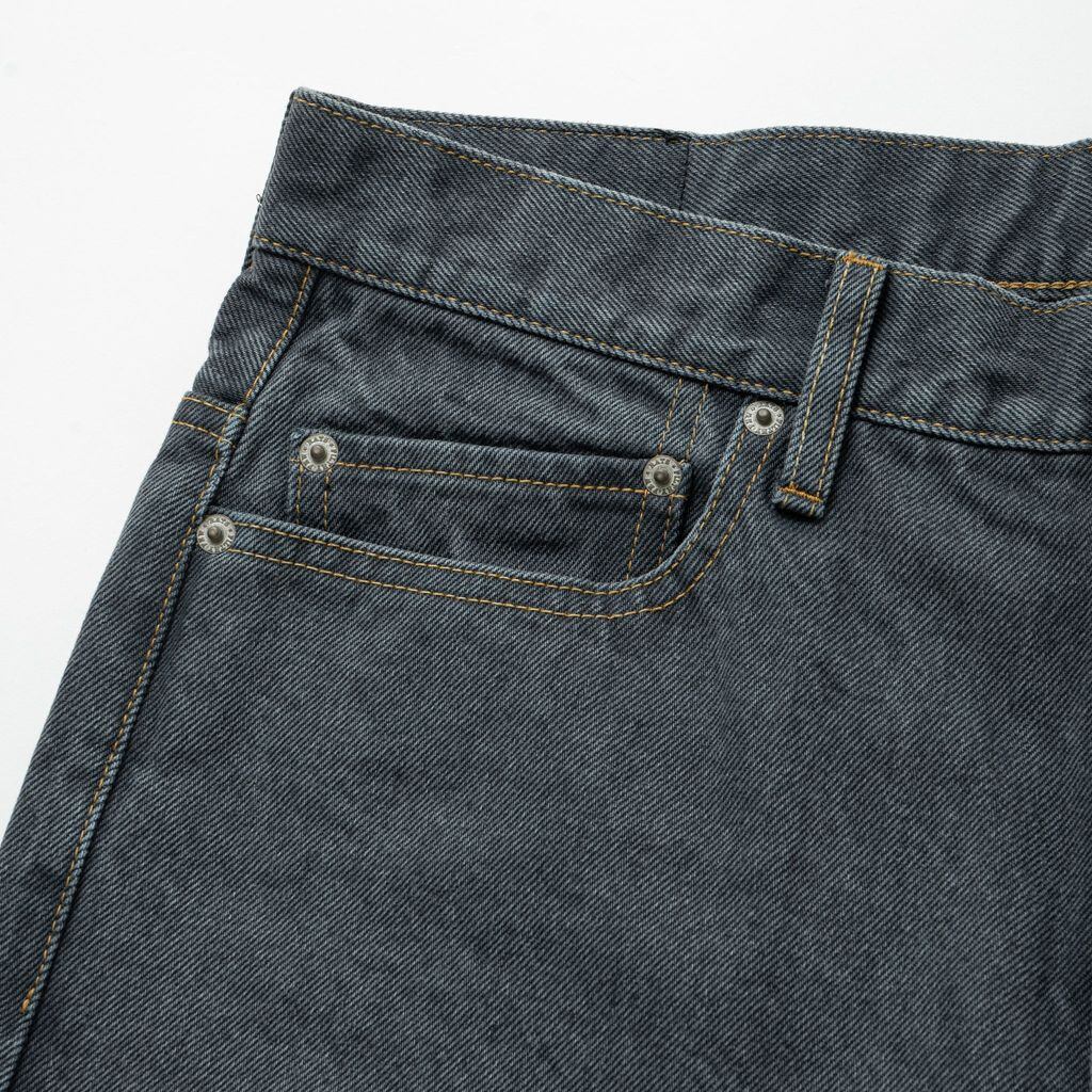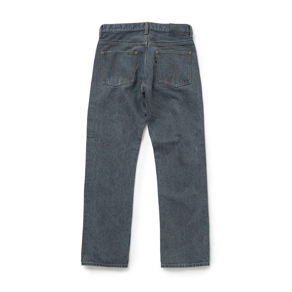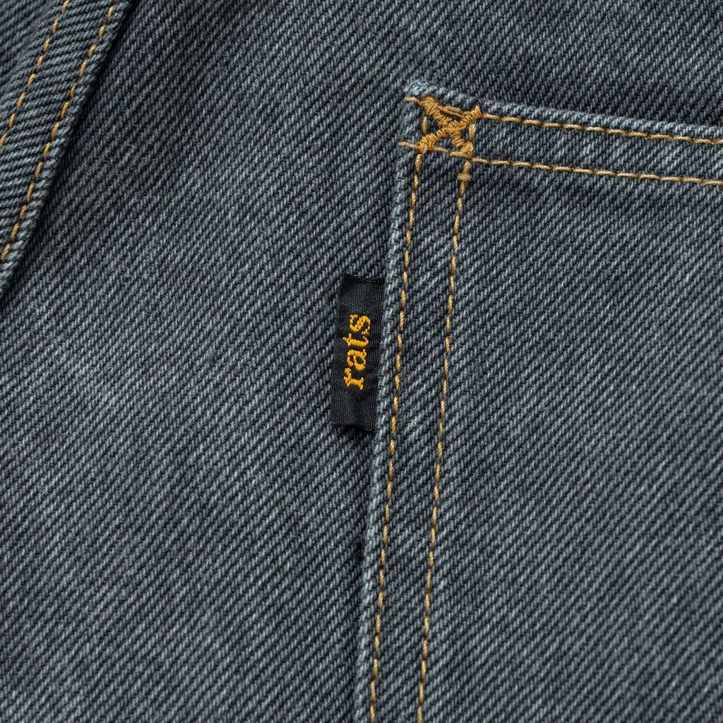 13.5oz.のデニム生地を使用した5ポケットデニムパンツ。全ての縫製糸を橙色で統一させ、身頃全体にユーズド加工を施したデザイン。両腰にL字型ポケット、フロント右にコインポケット、背面左右にパッチポケットを配置。右腰にBLACK AND YELLOWの刻印が入るレザーパッチを叩きつけ。ヒップポケットにはRATSデニムのアイコン、Ratテールのステッチが施された仕様。背面右ポケット左脇にピスネームを挟み込み。腿にゆとりのある、ヒップがコンパクトなストレートシルエット。