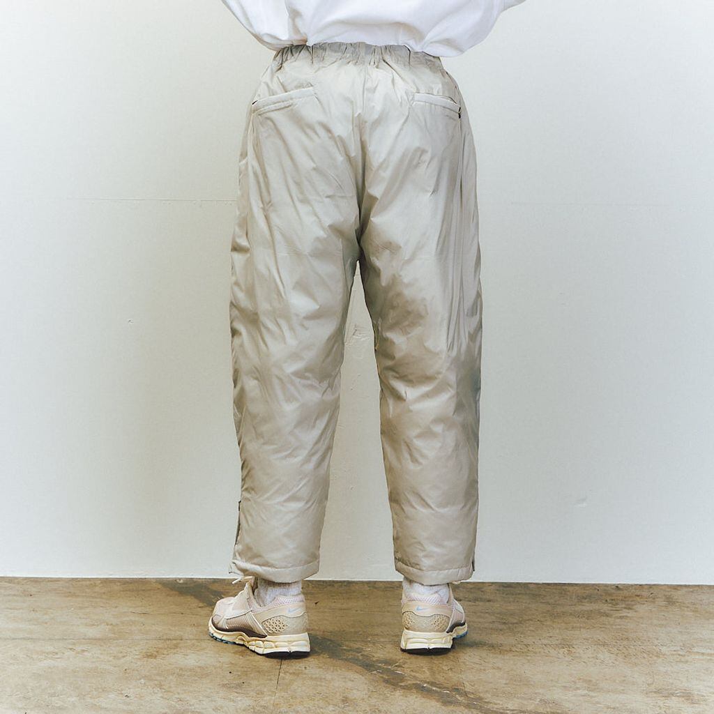 Lightweight and warm down pants in collaboration with TAION are airy and comfortable for use in town or on the road. These lightweight down pants are comfortable to the touch and keep you warm and comfortable even on windy days. Ventilation feature at the hem ensures breathability. With no seams, these pants are highly convenient and can be used for a wide range of purposes from outdoor activities to city wear. Down is lightweight and resilient with a minimum of 800flp.