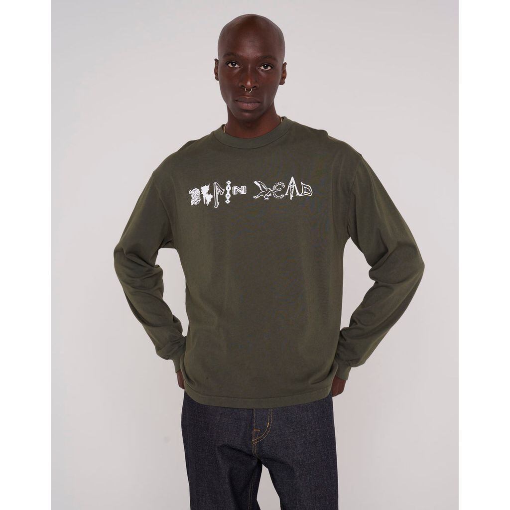 定番の長袖プリントTシャツ。前面に Brain Dead のタイポグラフィー、背面に地球の知恵のグラフィック。