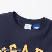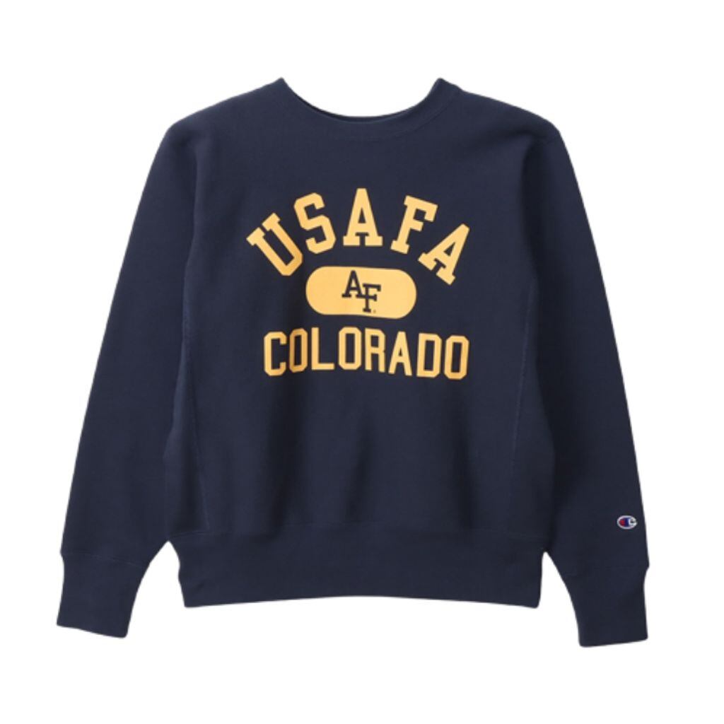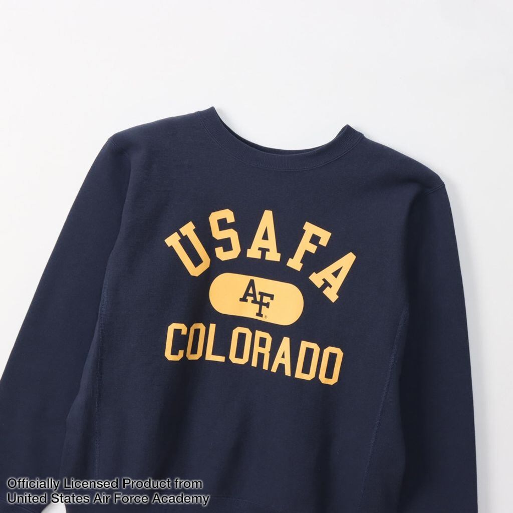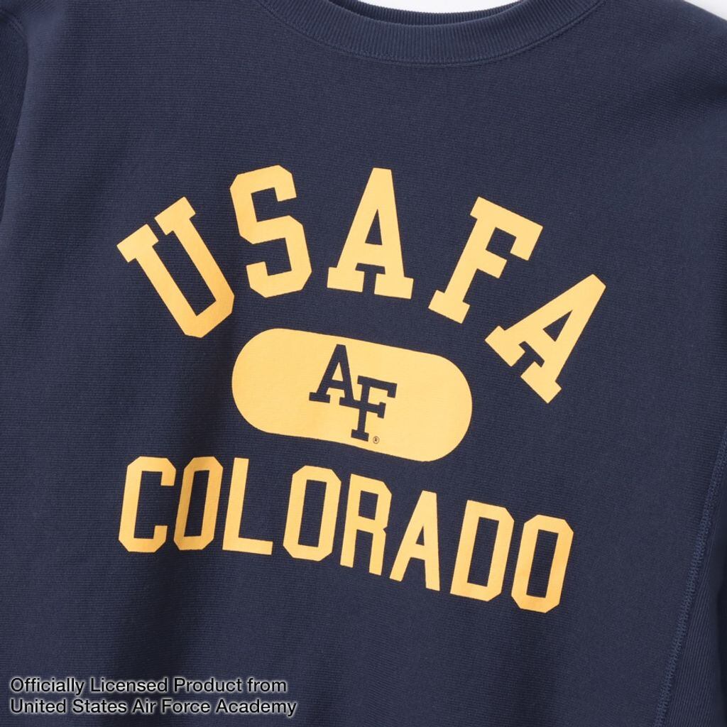 洗うほどにタフになり、着こむほどに独特の風合いや味が出る裏起毛素材を使用した「REVERSE WEAVE® 11.5oz. Terry Fleece(リバースウィーブ® 11.5オンス テリーフリース)」シリーズのクルーネックスウェットシャツです。コットン素材は環境に配慮して生産されたサステナブルなアメリカ綿を100%使用。本来は縦方向に使われる生地を横方向に使用する「REVERSE WEAVE®」製法によって縦の生地の縮みを防ぐと同時に、両脇に「EXPANSION GUSSET(エクスパンションガゼット)」を付けることで横の縮みへの影響を少なくし、動きやすさに配慮しています。胸のプリントはアメリカ合衆国の空軍士官学校(United States Air Force Academy)をモチーフにしたもので、アーチ型にレイアウトした「USAFA」の下に「AIR FORCE」を意味する「AF」を入れたカプセル、さらに学校の所在地である「COLORADO(コロラド)」を組み合わせたデザイン。シルバーグレーのボディには染み込みプリント、ダークネイビーのボディにはラバープリントを表現しています。ネームタグは1970年代モデルの「青単タグ」(青単色タグ)。アメリカの空軍士官学校は、士官候補生が正規士官として勤務するために必要な能力やリーダーシップ、知識を育成する4年制の学校。