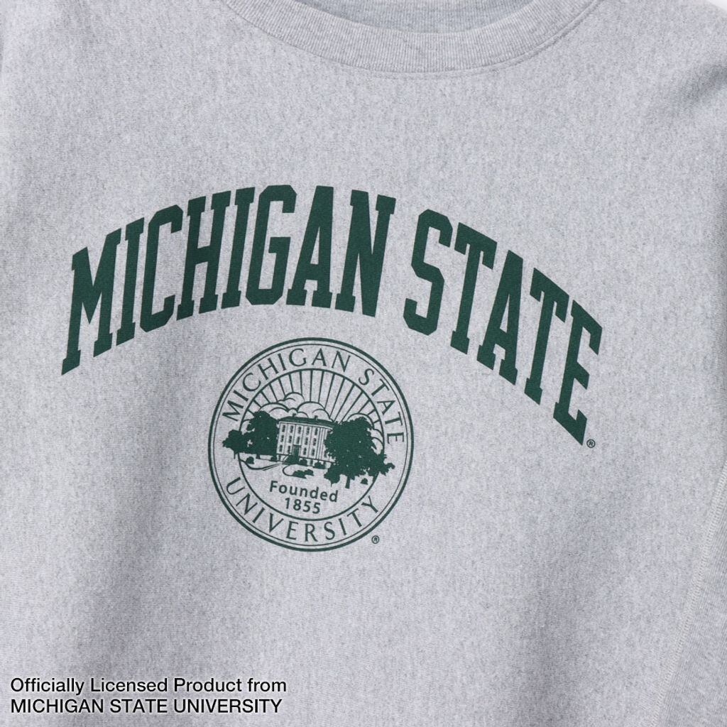Champion(チャンピオン)のスウェットシャツは、「ザ キング オブ スウェットシャツ」と評されるほど、世界中の多くのファンに愛されてきました。チャンピオンを代表する製法の「REVERSE WEAVE®(リバースウィーブ®)」。USAコットンの持つざっくりとした風合いと肉厚な生地、しっかり起毛された裏地が特長のアメリカ製モデル「REVERSE WEAVE® 12.5oz. Terry Fleece(リバースウィーブ® 12.5オンス テリーフリース)」の、オフィシャルカレッジライセンスシリーズのクルーネックスウェットシャツです。本来は縦方向に使われる生地を横方向に使用する「REVERSE WEAVE®」製法によって縦の生地の縮みを防ぐと同時に、両脇に「EXPANSION GUSSET(エクスパンションガゼット)」を付けることで横の縮みへの影響を少なくし、動きやすさに配慮しています。襟ネームのタグには1970年代モデルの「赤単タグ」(赤単色タグ)を採用。「MICHIGAN STATE(ミシガン州立大学)」のプリントは、アーチ状にレイアウトした「MICHIGAN STATE」の下に校章を入れたデザインで、オックスフォードグレーのボディには染み込みプリント、モスグリーンのボディにはラバープリントを使用しています。ミシガン州立大学は1855年に創立。アメリカ合衆国ミシガン州イーストランシング市に位置する総合州立大学で、公立の大学でアイビー・リーグ大学レベルの教育を受けられる、いわゆるパブリック・アイビー(Public Ivy)の一つです。