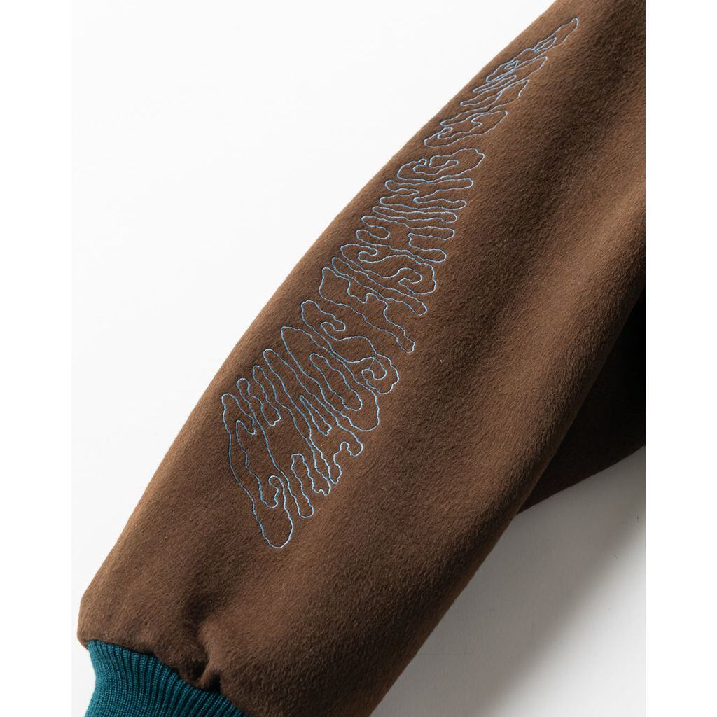 Chaos Fishing Club とのコラボレーションしたスタジャン。重厚感と高級感のある本格的な仕様。インパクトのあるグラフィック。BOX シルエットであの頃感を目指しました。ざっくりとした大きめのサイジングです。 配色を抑えることでインパクトを持ちつつも、落ち着いた印象でコーディネートに取り入れやすいアイテムを目指しました。