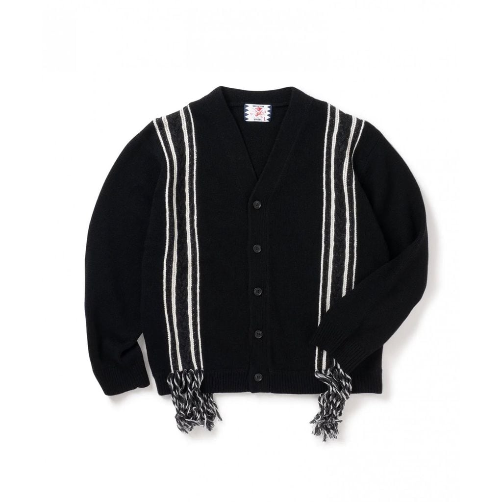 配色のケーブルを編み立てたニットカーディガン。 裾部分に施されたフリンジが特徴です。
