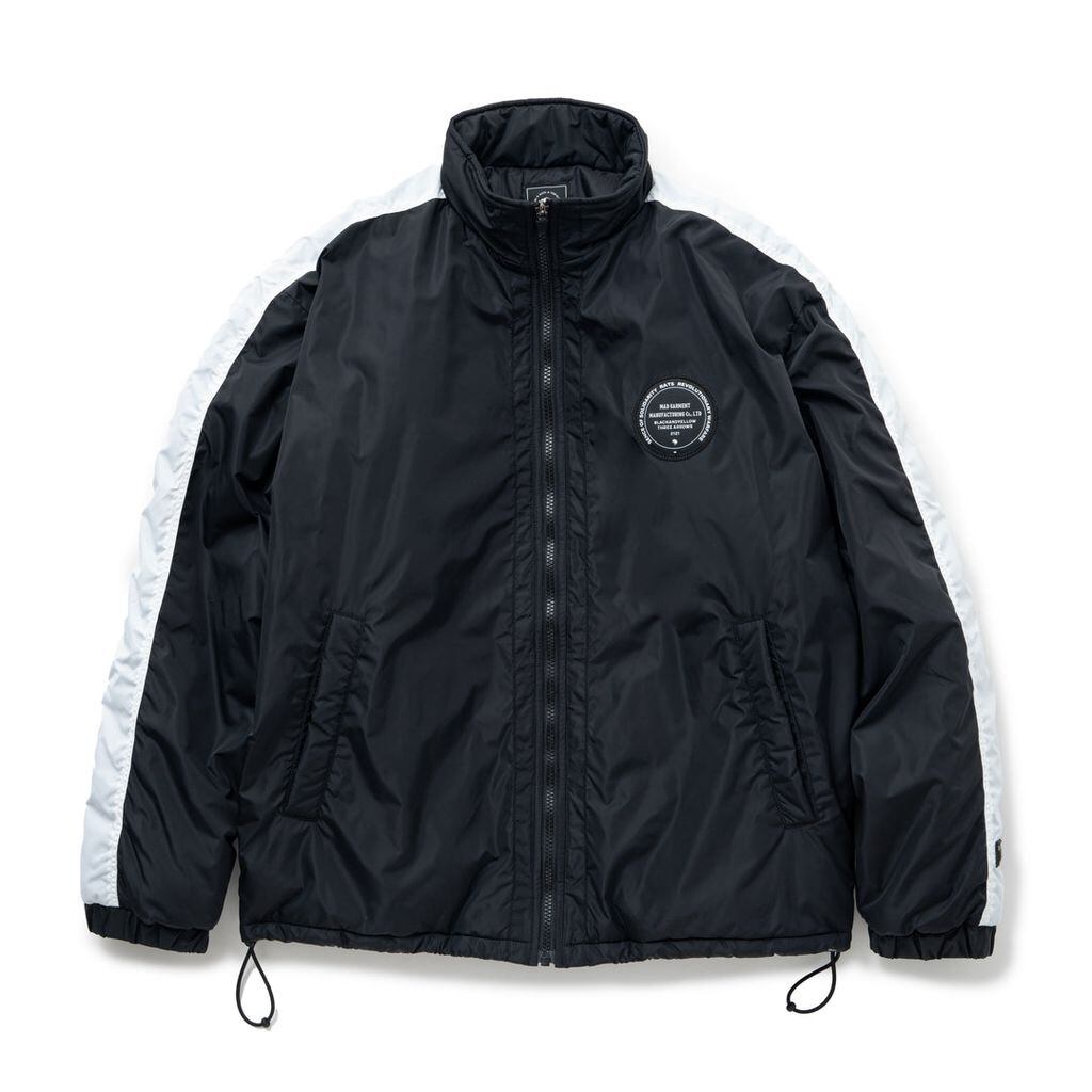 表地に撥水性のあるナイロン生地、裏地にはプリマロフト中綿入りのリップストップナイロン生地を使用したスタンドカラーのトラックジャケット。左胸にレターグラフィックを刺繍したサークル型フェルトワッペン、左袖にBLACK AND YELLOWを刺繍したフェルトワッペンを叩きつけ。両腕に身頃と配色を切り替えたラインテープを配置した仕様。裾両端にスピンドルが付属、シルエット調整が可能。身幅にゆとりのあるシルエット。1色5サイズ展開。