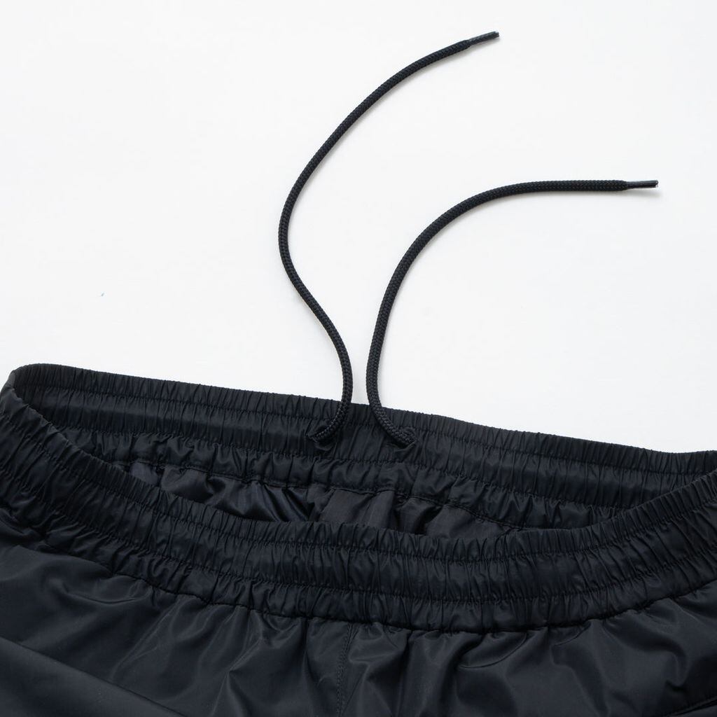 表地に撥水性のあるナイロン生地、裏地にはプリマロフト中綿入りのリップストップナイロン生地を使用したトラックパンツ。両脇にスラッシュポケット、背面右に両玉縁ポケットを配置。右腰前にBLACK AND YELLOWの織ネームを叩きつけ、左ポケット下にRatモチーフのピスネームを挟み込み。ウエスト内側にスピンドルが付属、シルエット調整が可能。ウエスト・腿周りにゆとりのあるストレートシルエット。1色5サイズ展開。