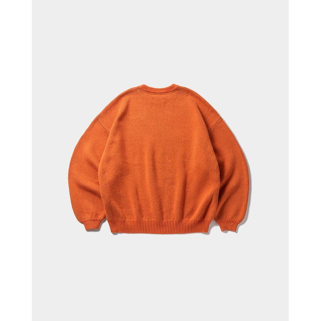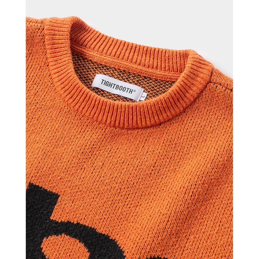 右袖から左袖までかかるビッグロゴをジャカード編みで表現した厚手のプルオーバーニットトップ。
