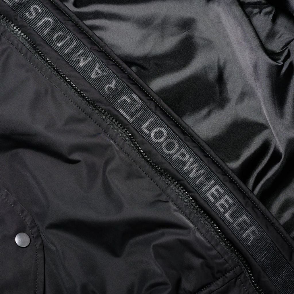 BLACK BEAUTYシリーズの生地と仕様を落とし込んだMA-1 BOMBER JACKET。左袖裏をLOOPWHEELERのスウェット生地で切り返した仕様。前立て部分は両ブランドのロゴがエンボス加工により表現されたオリジナルのテープを採用し、右袖にはバッグシリーズ特有の仕様であるハギとブランドネームタグを配した1着。LOOPWHEELER x RAMIDUSロゴ入りネックストラップ付き。