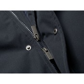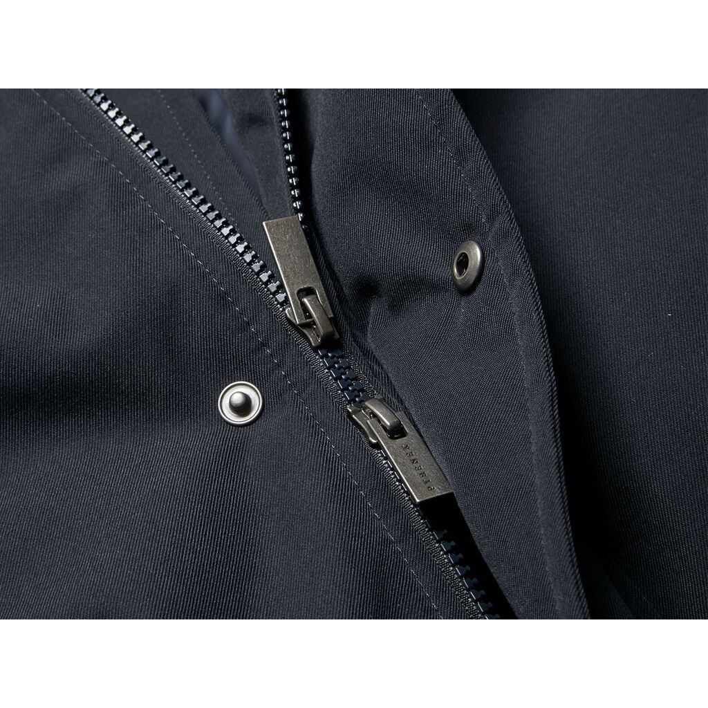 スーツやジャケットの上から着てもストレスを感じないように肩回りや腕のパターンは立体的にし、着丈も十分な長さをキープしています。表地には高密度に織られたポリエステルギャバジンを採用し、軽量でロフト感のある上質なフレンチダックダウンを充填しています。