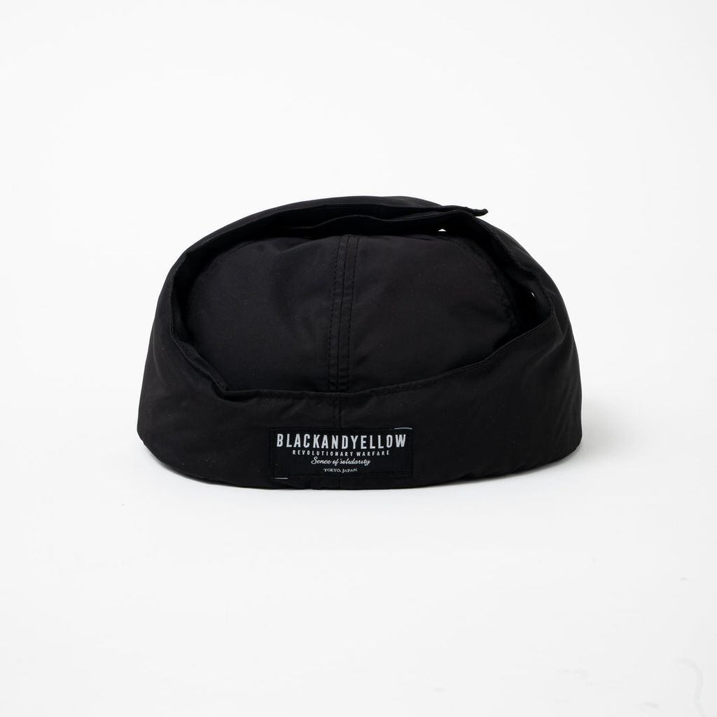 フロントパネルにSENCE OF SOLIDARITYのレターグラフィックを刺繍表現したサークル型フェルトパッチ、後部にBLACK AND YELLOWネームを刺繍した織ネームを叩きつけ。イヤーマフは頭部スナップボタンで収納が可能な仕様。1色2サイズ展開。