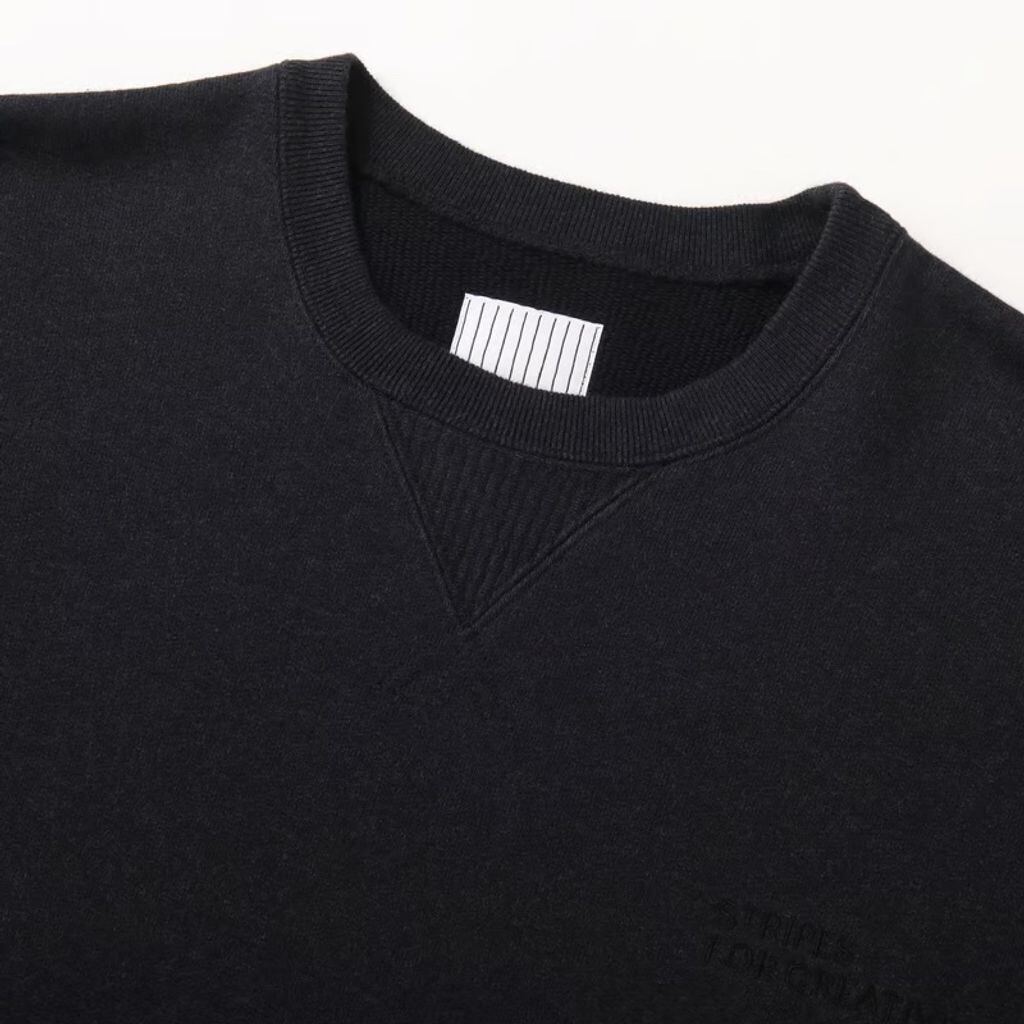 SFC定番のオーバーサイズクルースウェット。首元にオリジナルストライプ柄の刺繍を施したVガゼットを取り付けUPDATEしています。