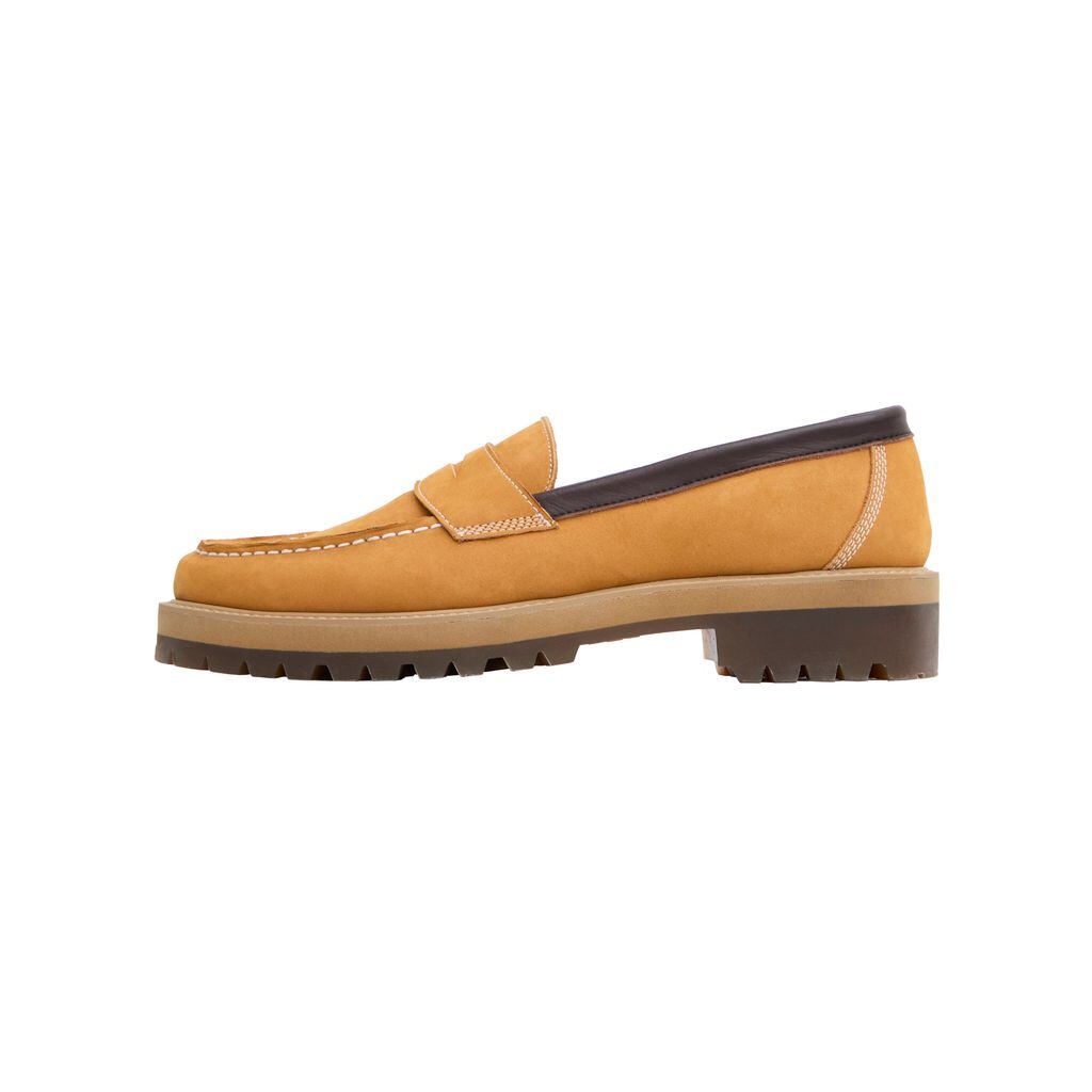 前シーズンにリリースされたTomo and Coに別注をしたオリジナルコインローファーを、素材を変更して再制作しました。Tomo & Coのインラインのローファーからアッパーを手縫いモカにするなど、大幅に改修し、本家よりもカジュアルな表情に仕上げました。アウトソールにはVibram社のEVA素材のタンクソールを採用し、クラシックなビジュアルながらスニーカーのような履き心地を実現しています。ライニングにはオレンジのライニングレザーを使用し、MAGIC STICKのアイデンティティカラーを取り入れました。定番色としてリリースされるブラックは、ハイブランドのレザーシューズと遜色のない仕上がりで、牛ステアのガラス仕上げとなっています。シーズナルカラーのイエローヌバックは、某ワークブーツをサンプリングし、4本ステッチなどを再現し、タフな仕上がりになっています。これはブランドの定番品として毎シーズンリリースされ、人気のモデルです。